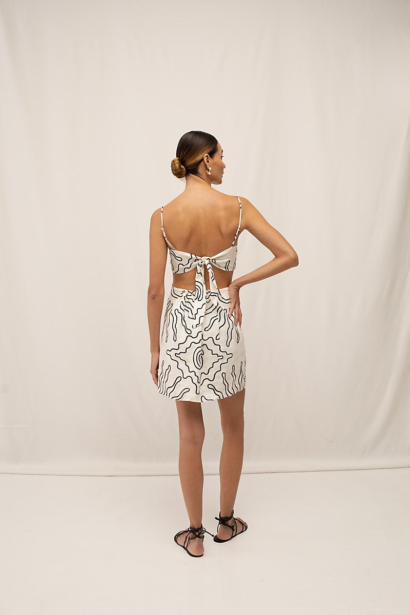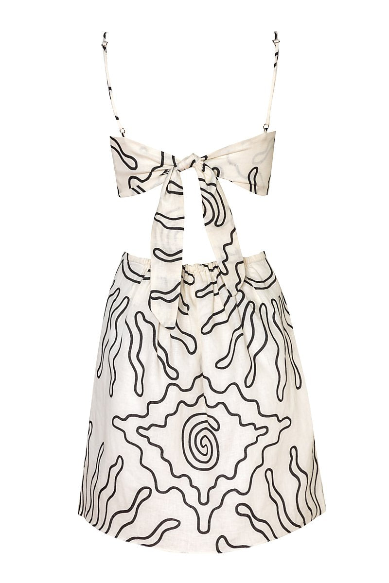 Short dress with side cutouts and back zipper featuring back self-tie straps. Made from 100% linen.