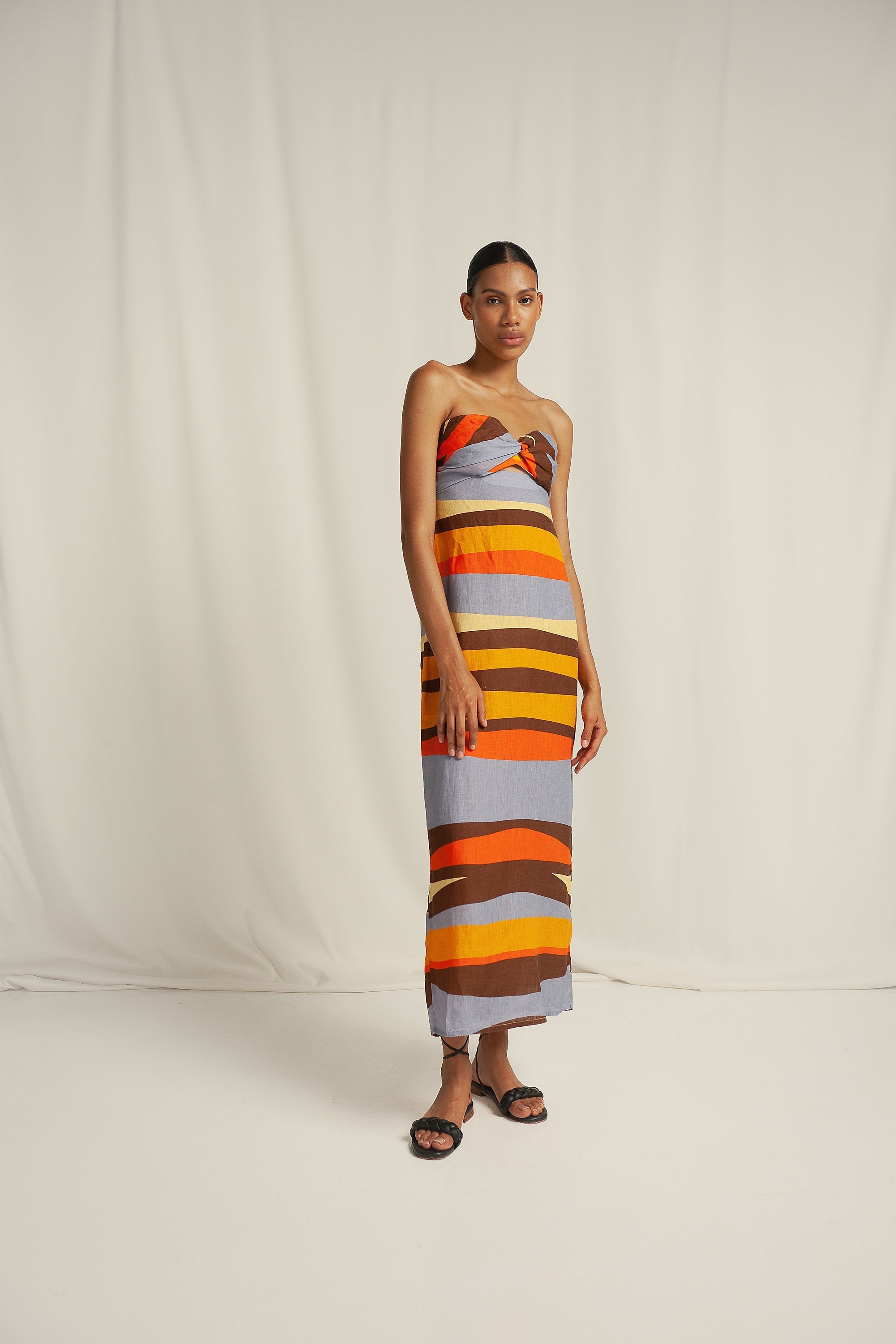 Midi dress with interlaced top featuring a front keyhole cutout and removable adjustable straps. Fully lined. Made from 100% linen.