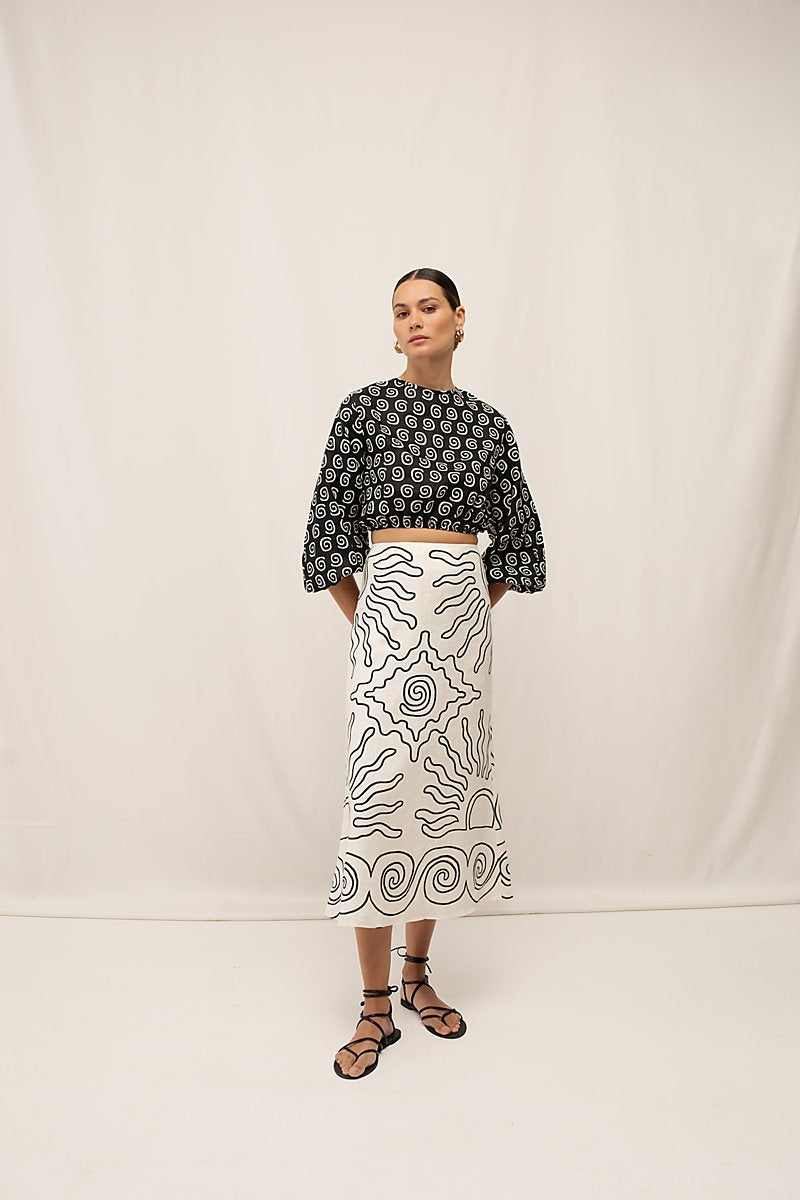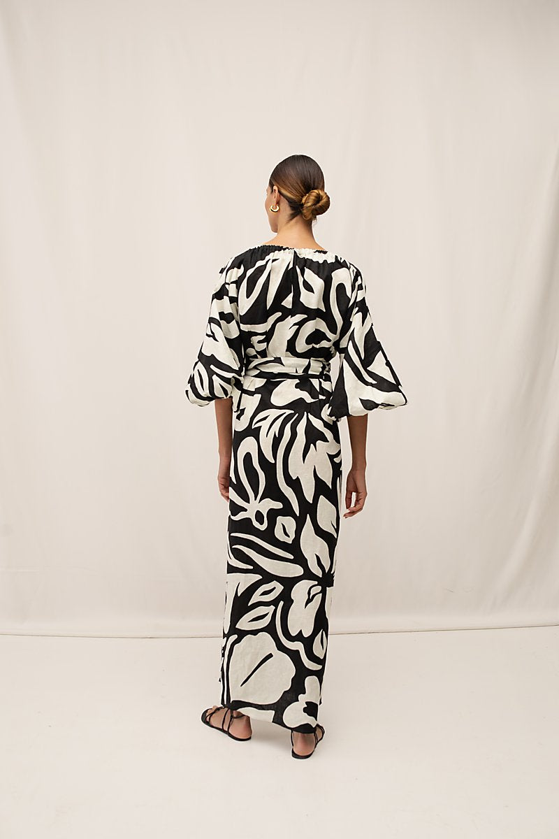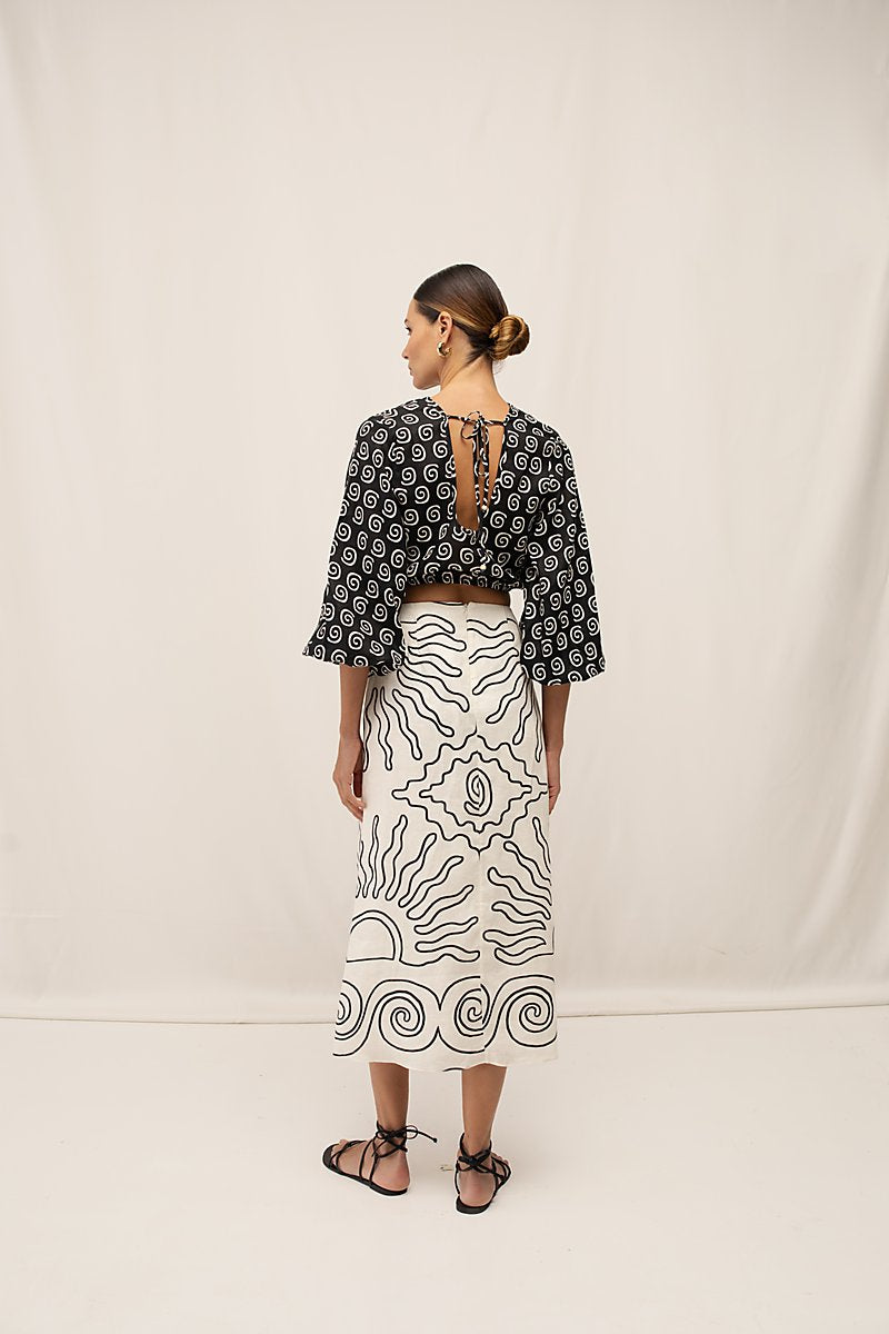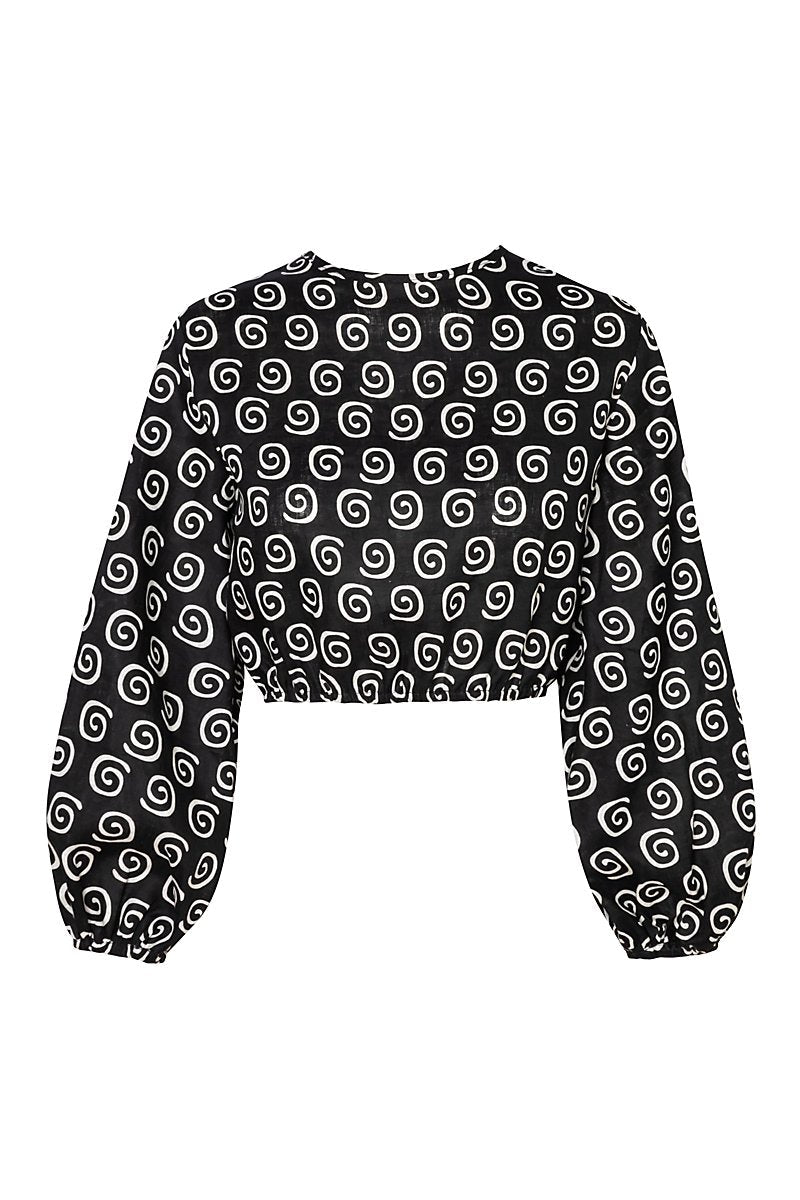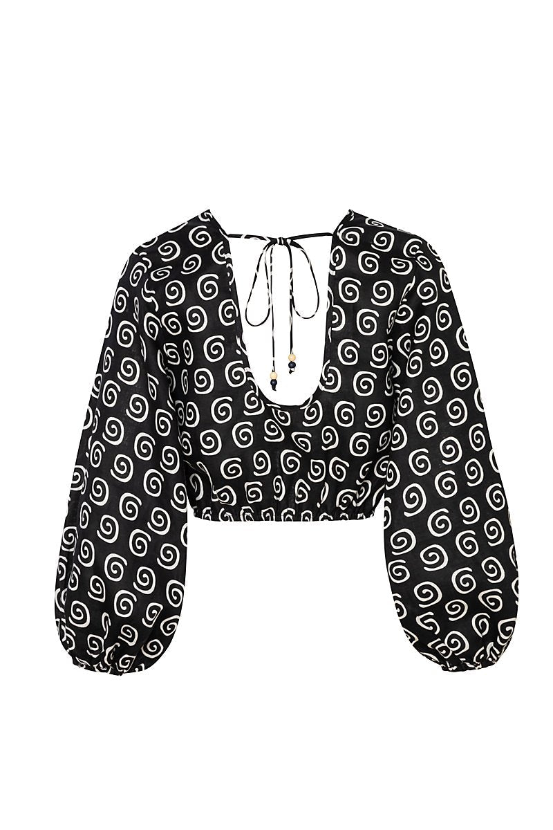 Long puff sleeve crop top with open back. Made from 100% linen.