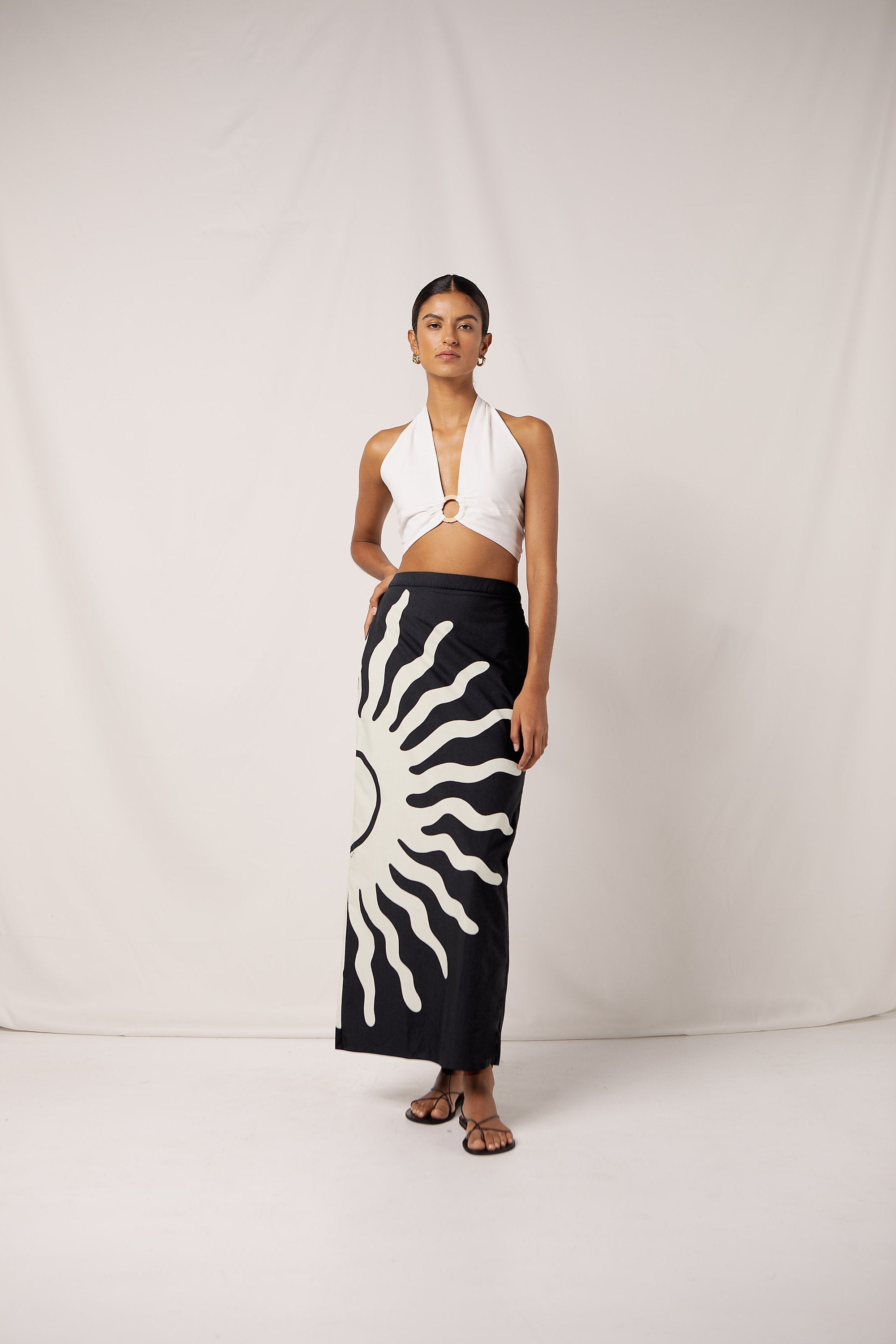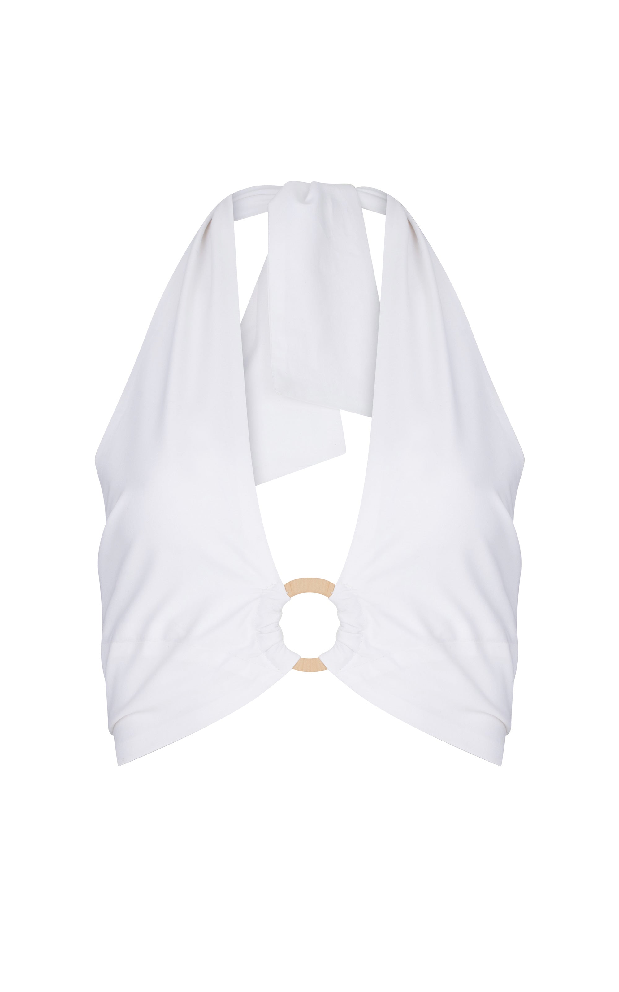Backless halter style top with criss cross back self tie straps. Fully lined. Made from 100% Cotton.