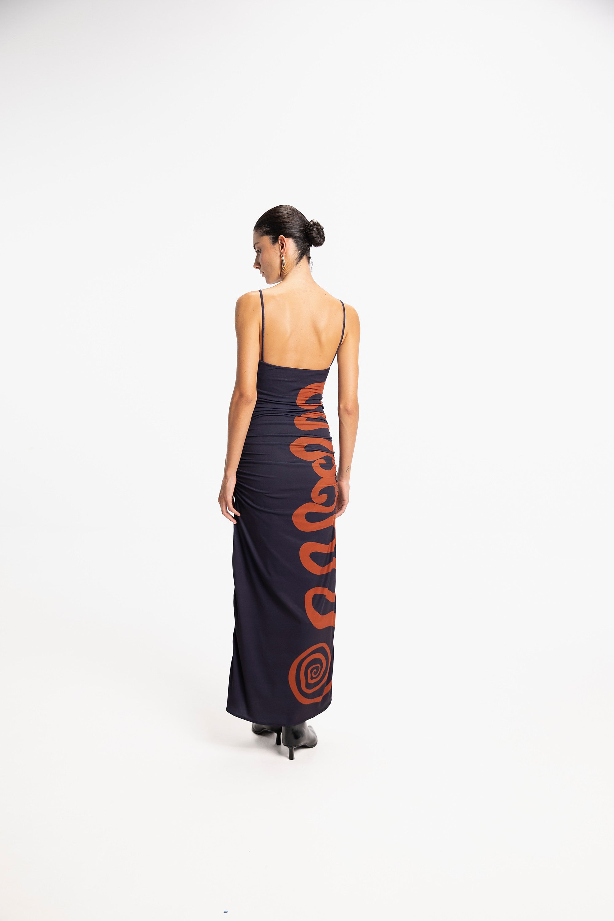 Sleeveless long dress with boat neckline and rouched sides. Made from 95% Polyester 5% Elastane.