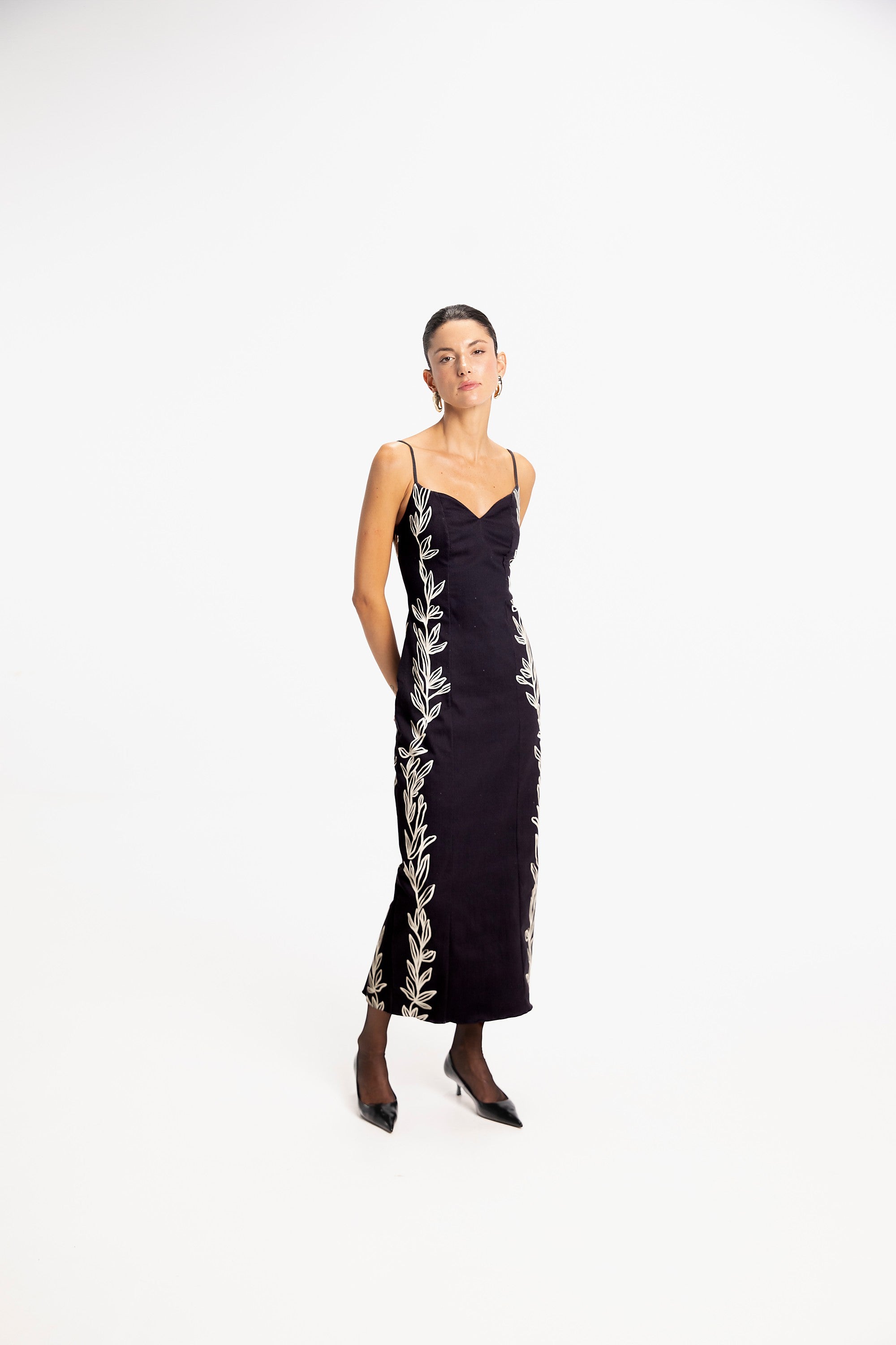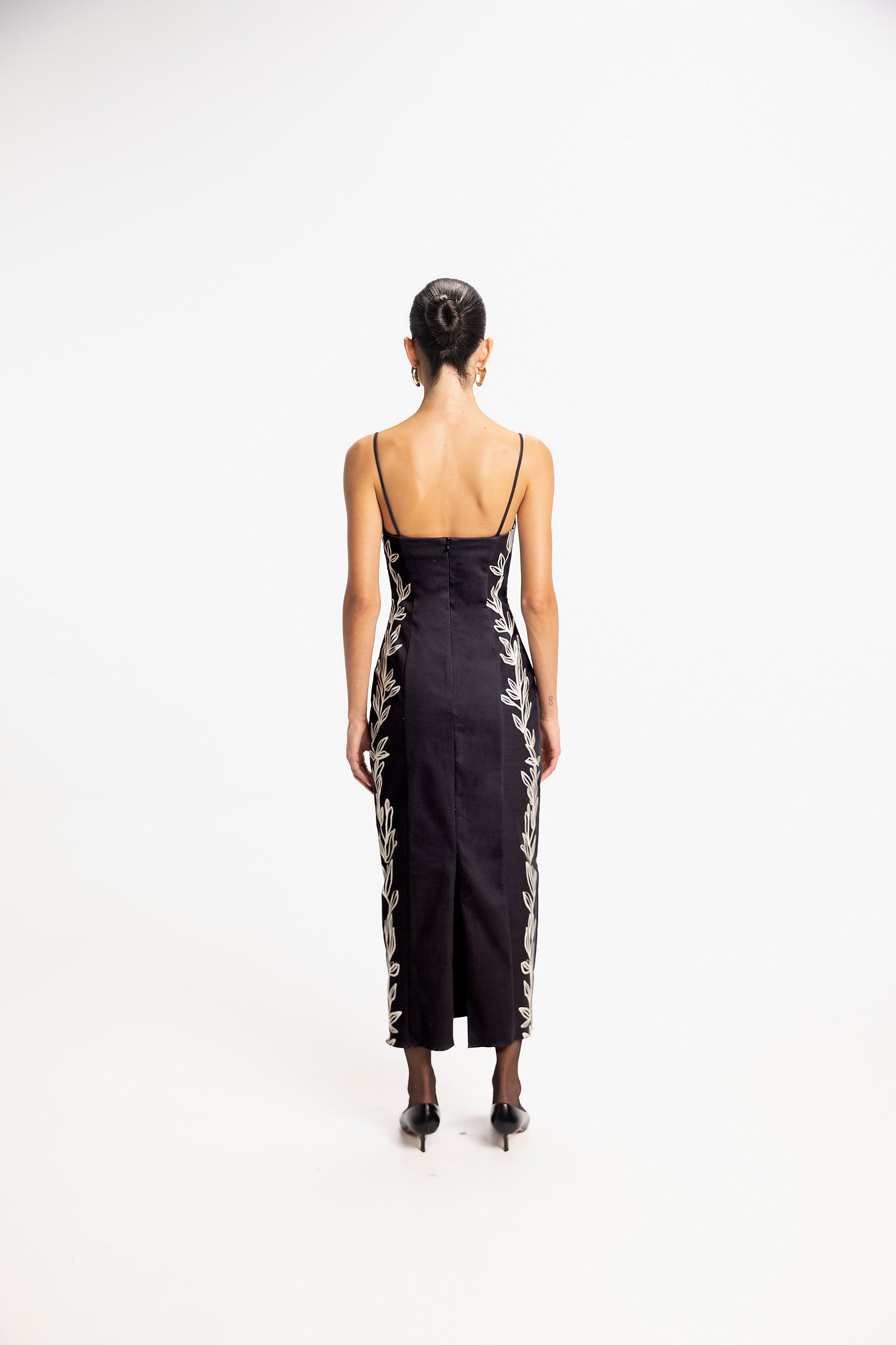 Fitted sleeveless heart style neckline midi dress. Made from 96.5% Cotton 3.5% Elastane.