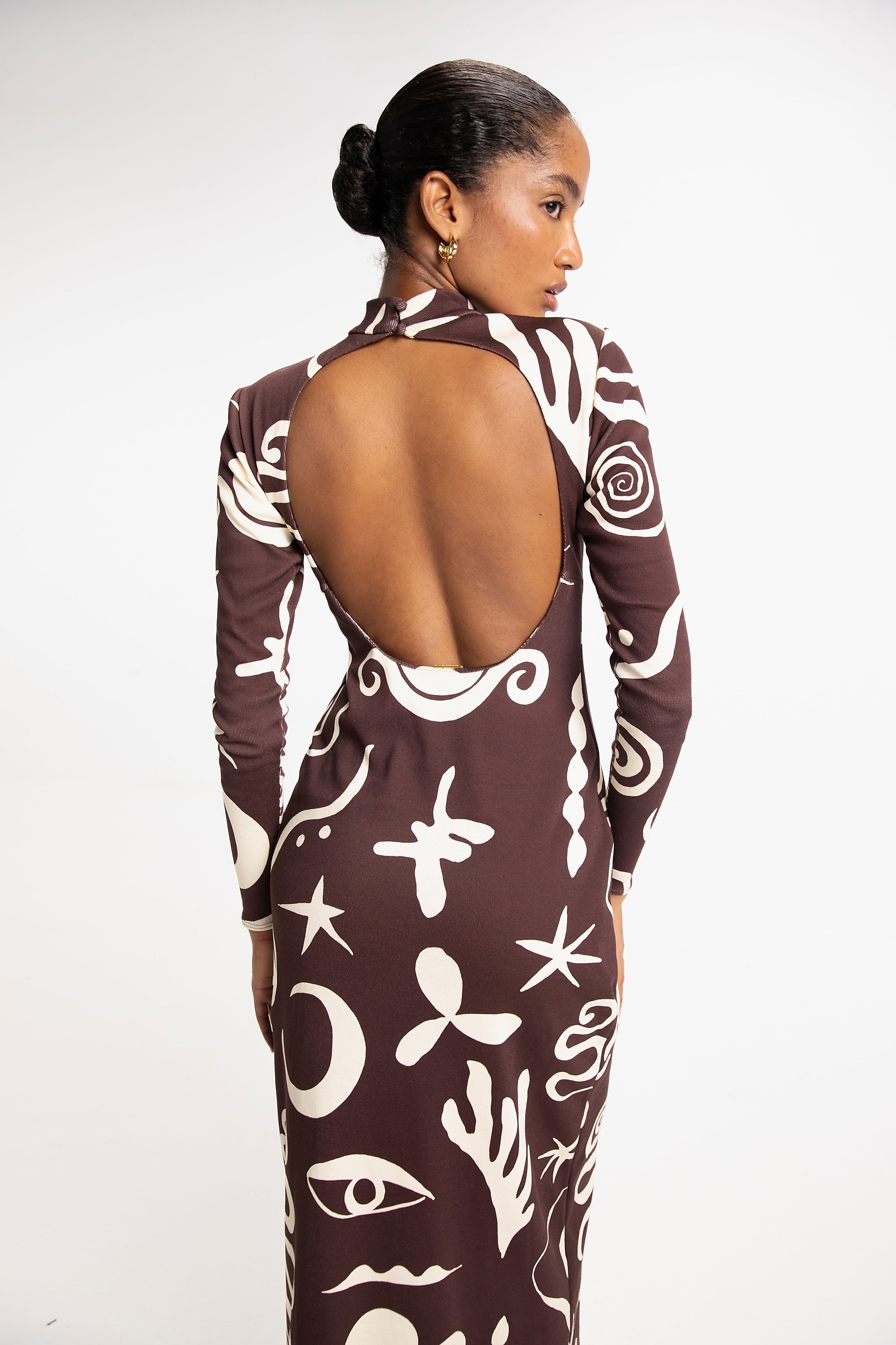 High turtleneck long dress with rounded open back. Made from 100% Organic Cotton.