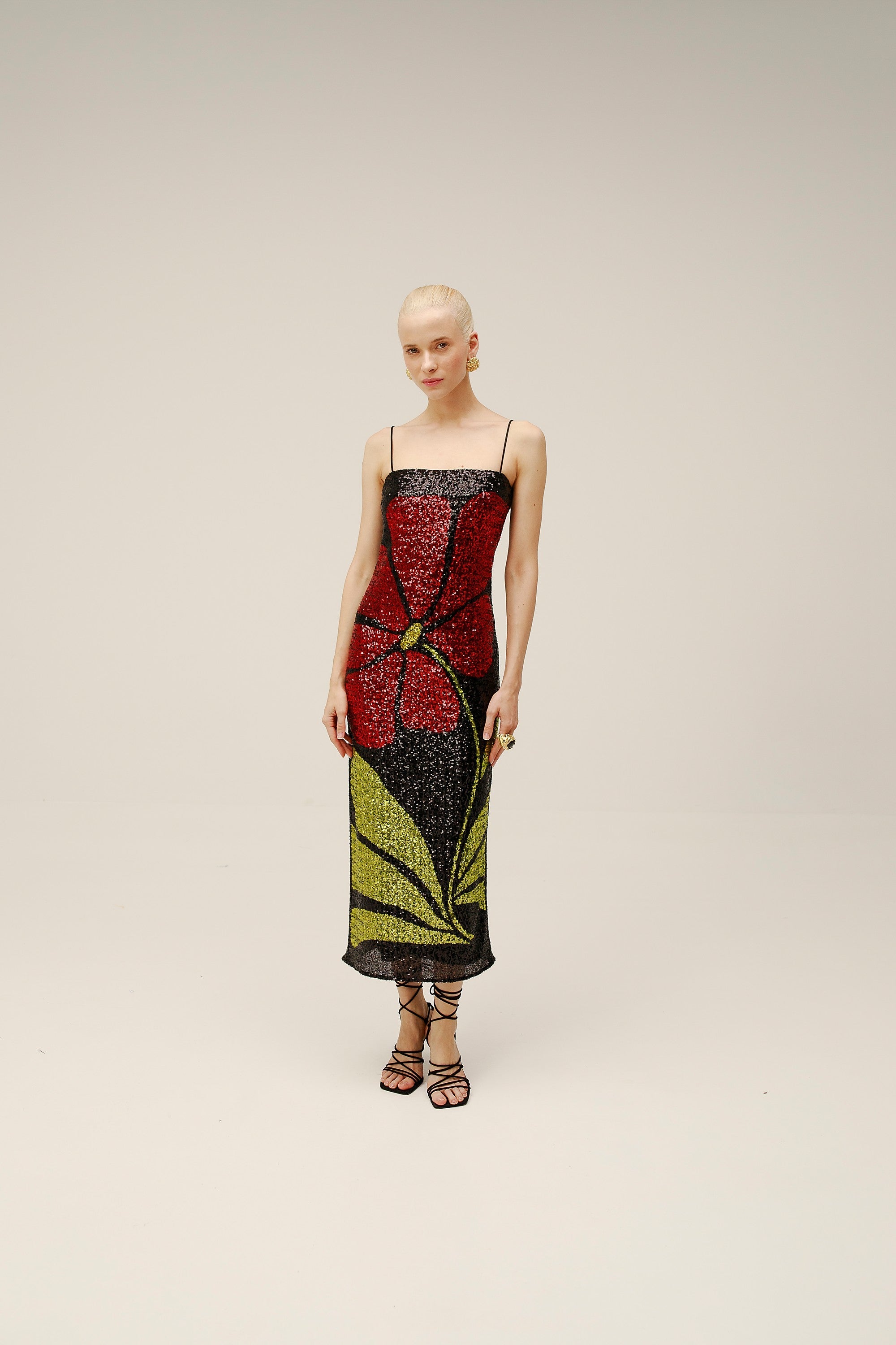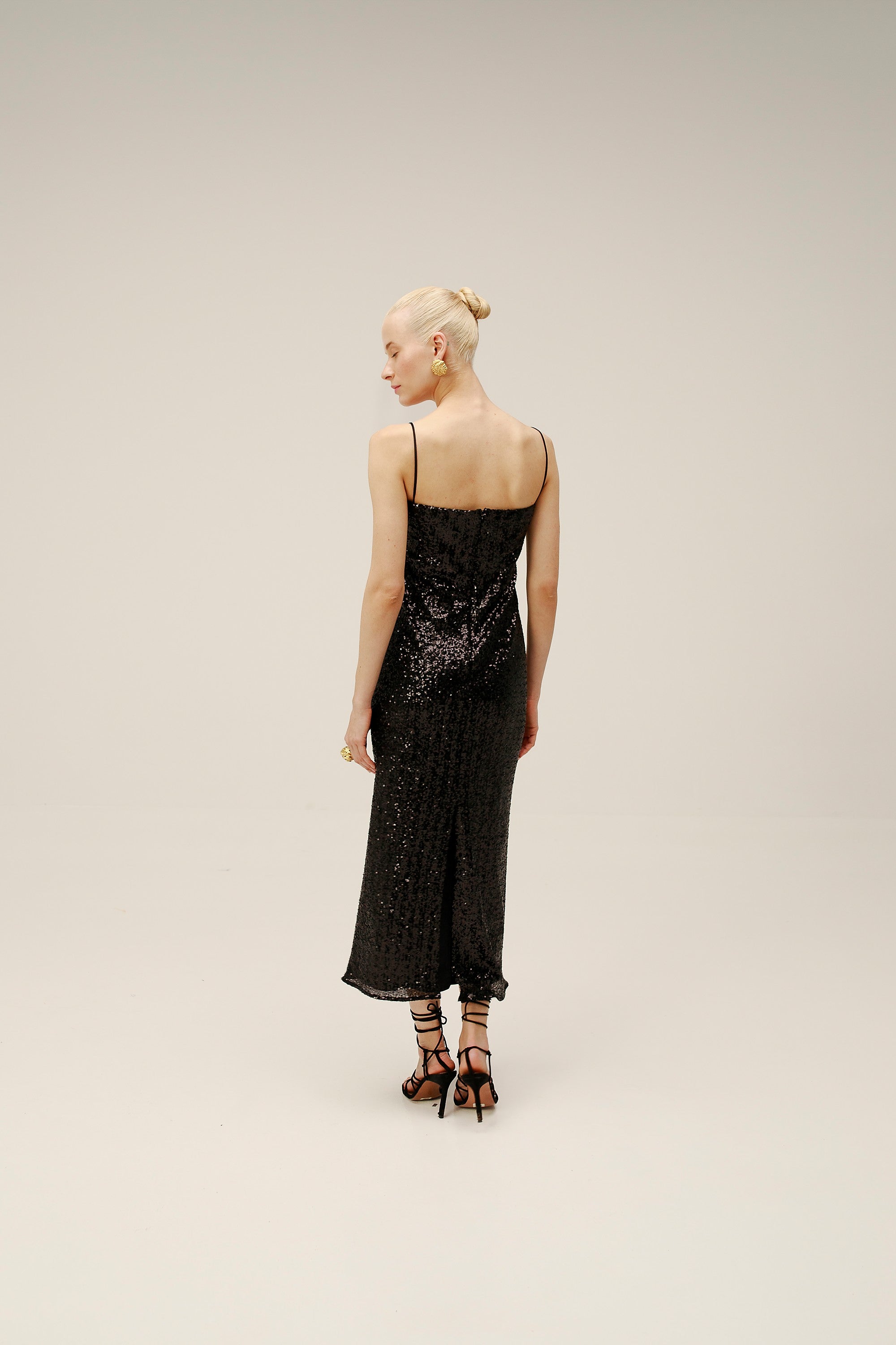 Sequin midi dress featuring thin straps. Made from 95% Polyester 5% Elastane