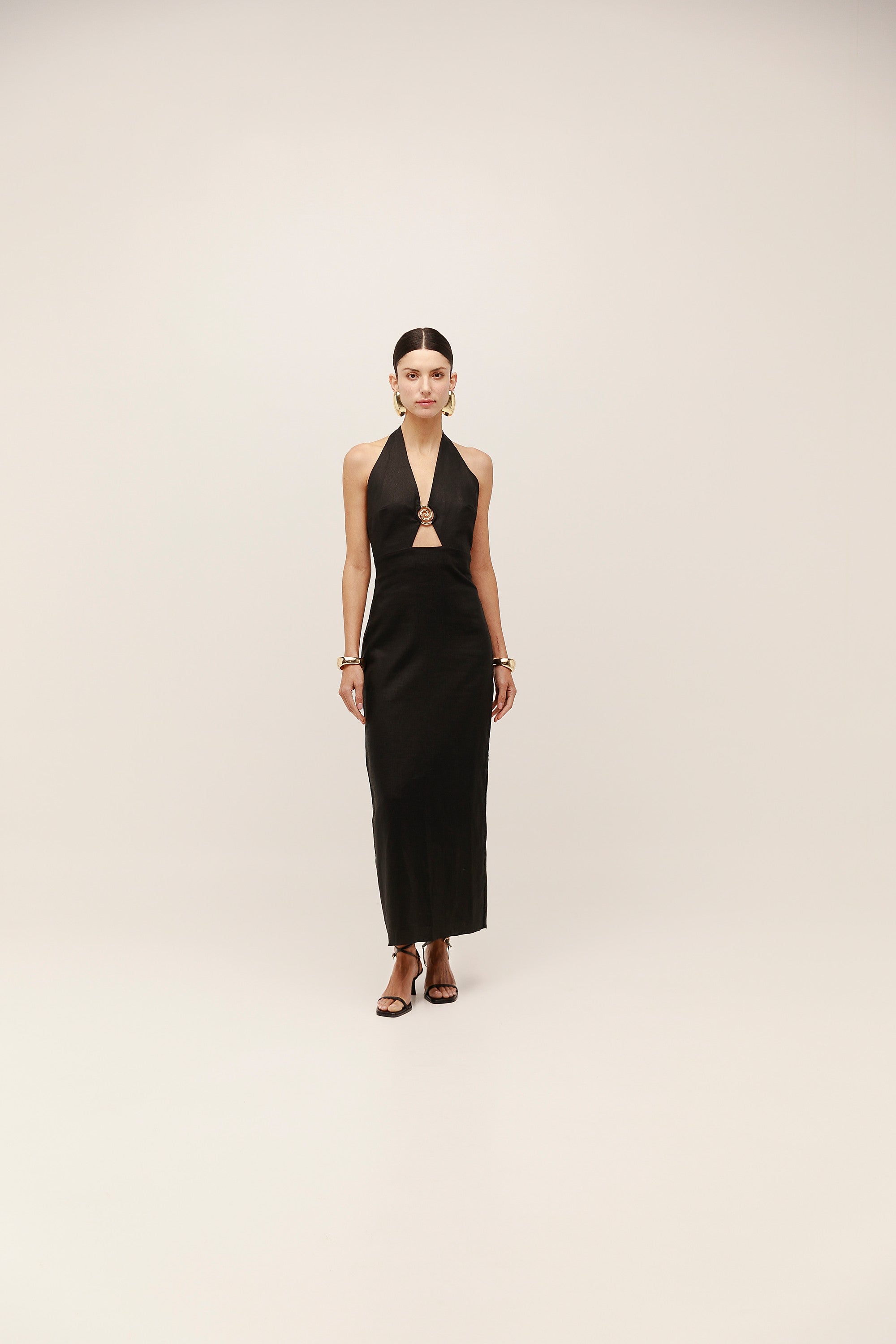 Long halterneck dress with an open back, center back cutout, and swirling hardware detail at the front. Fully lined. Made of 100% linen.