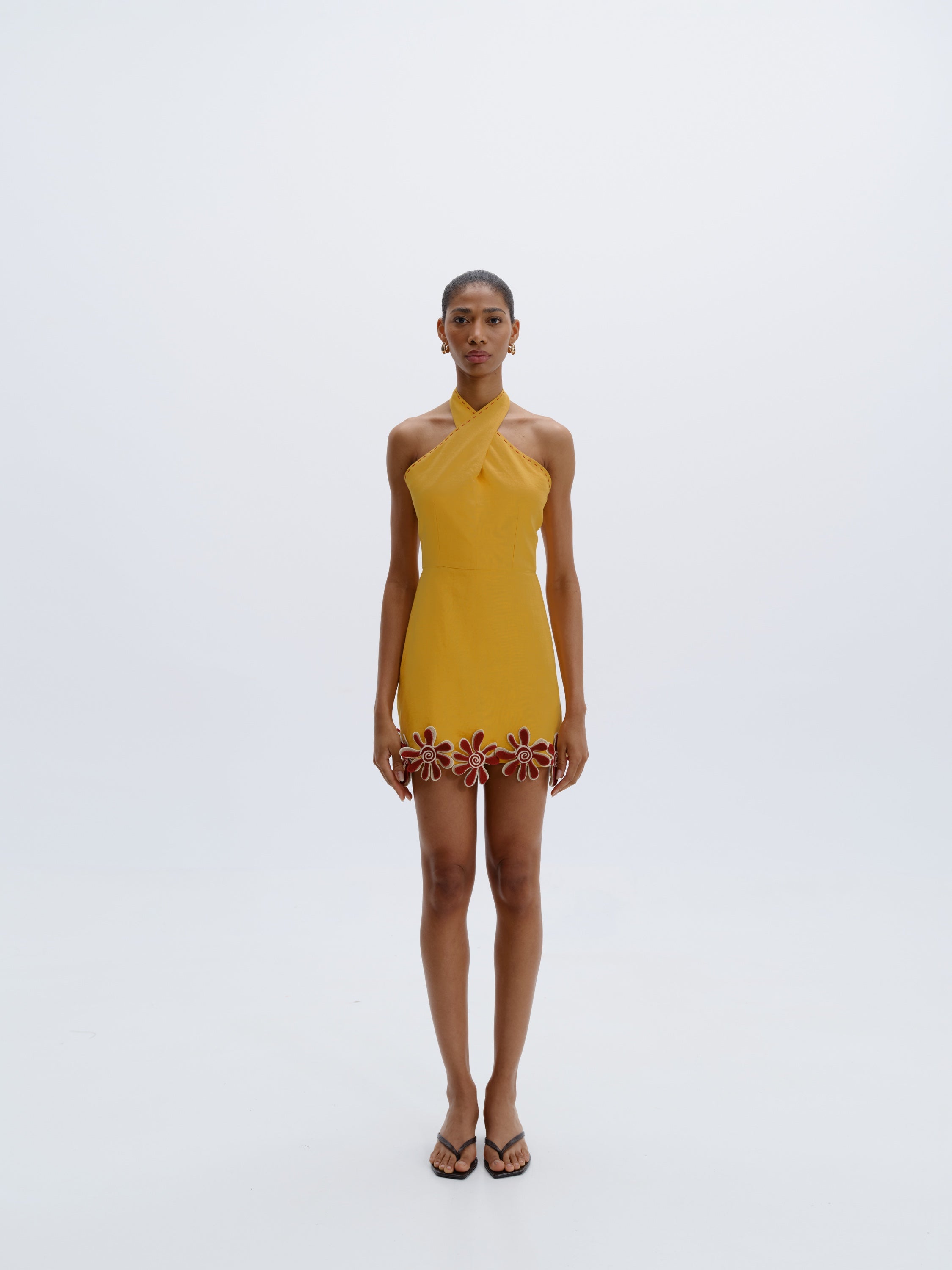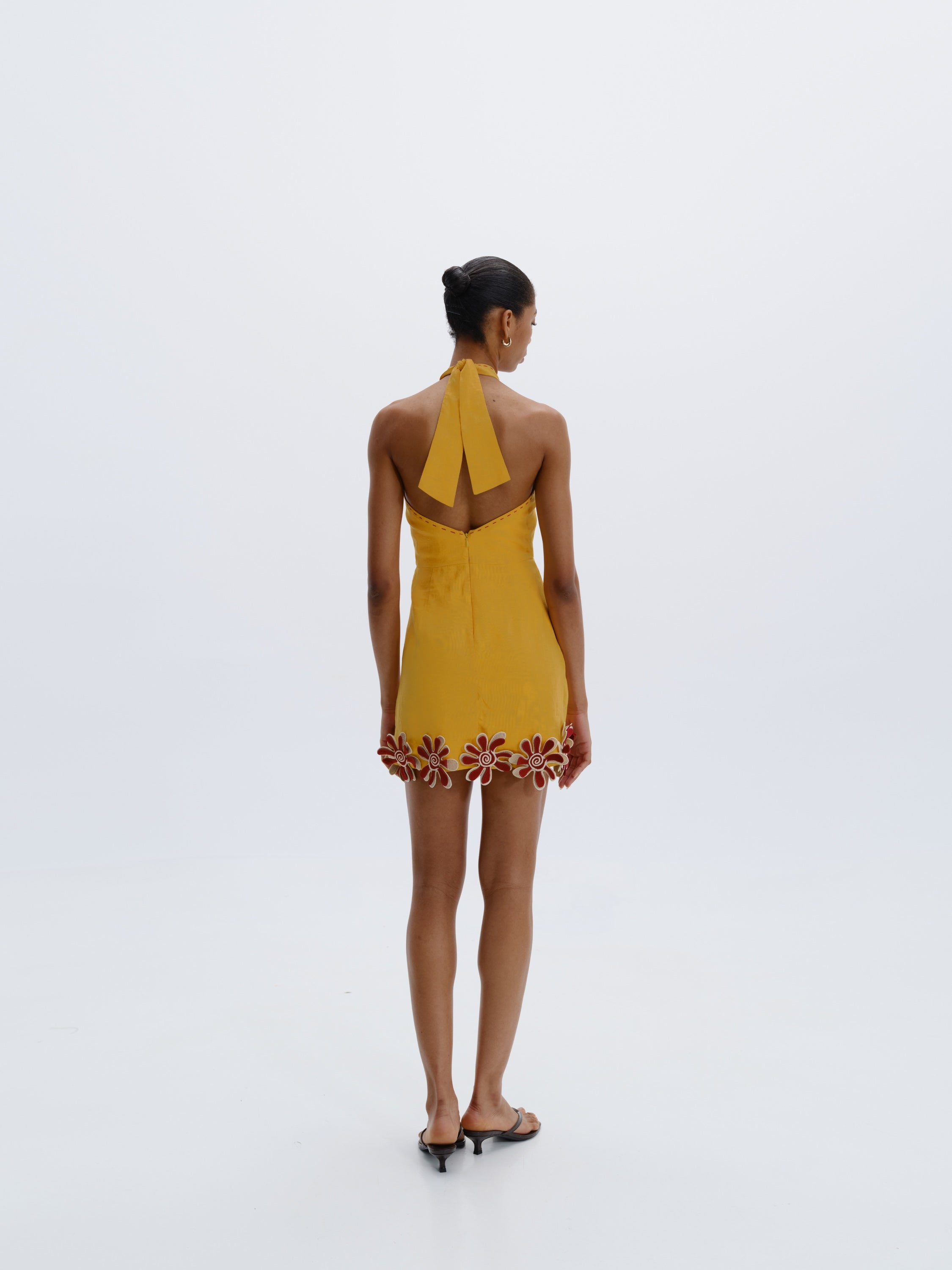 Backless halterneck mini dress with crisscross straps featuring aplpiqued flowers on hem. Fully lined. Made of 100% linen.