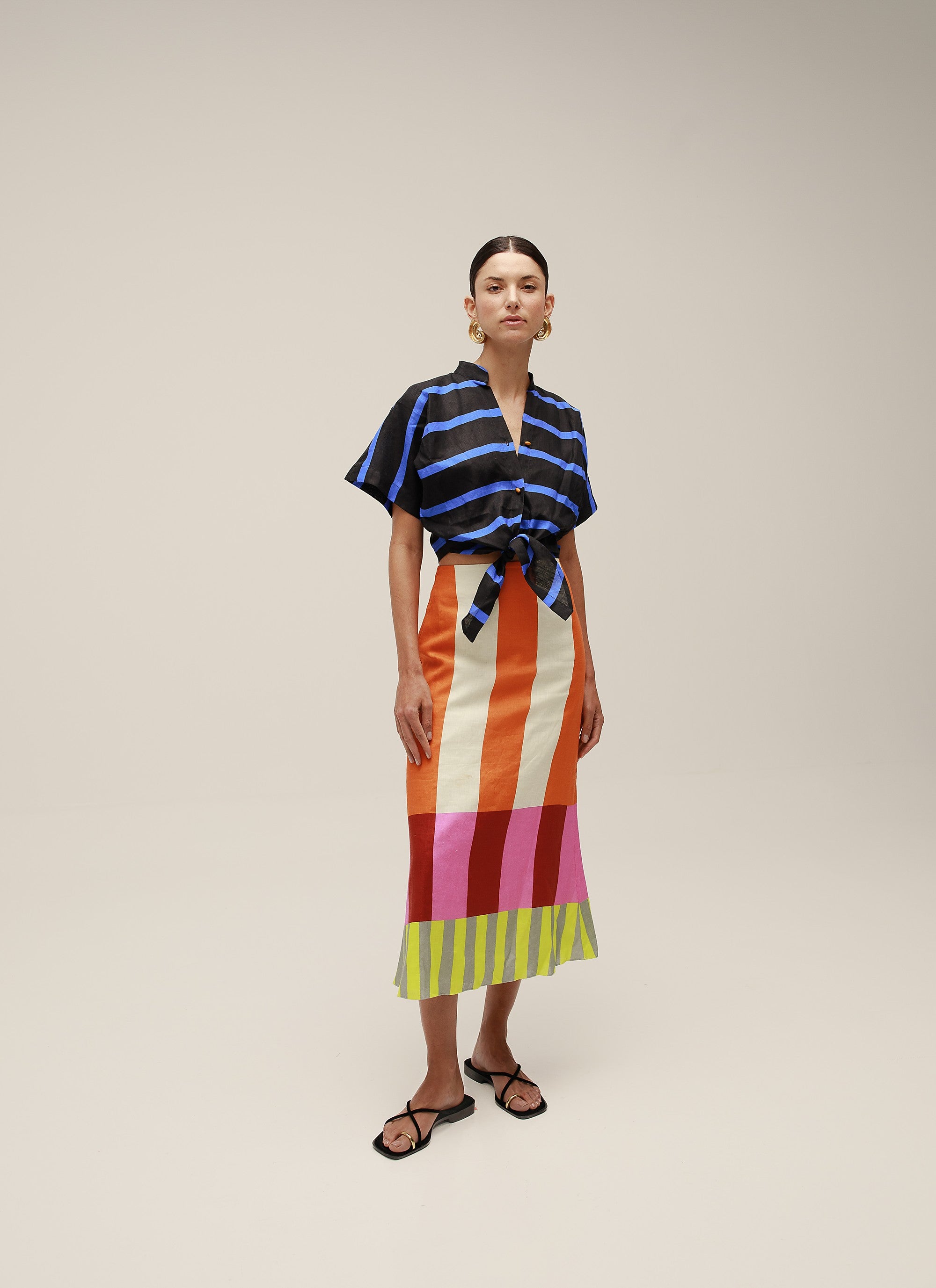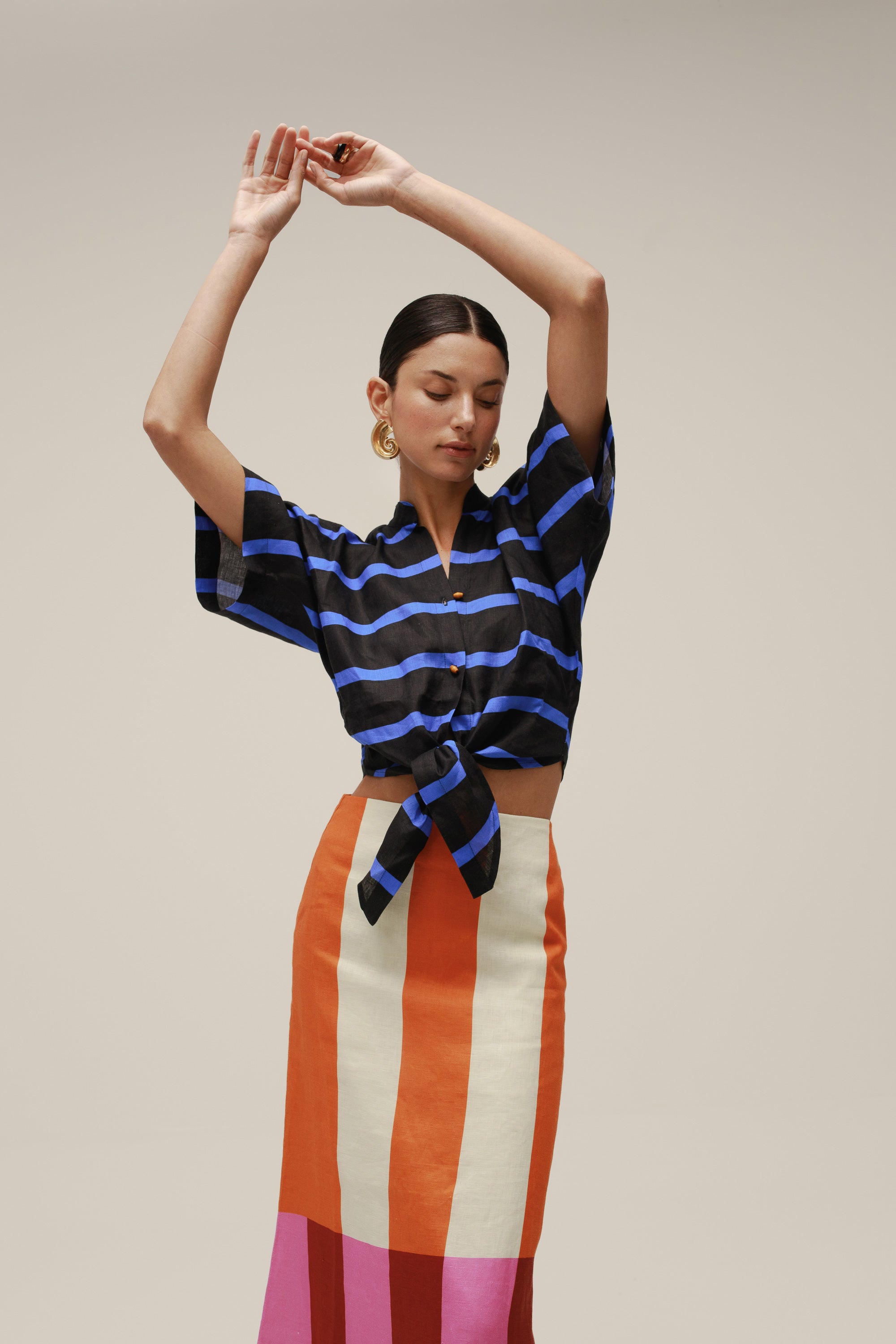 Short sleeve button down shirt with front tie. Made from 100% Linen.