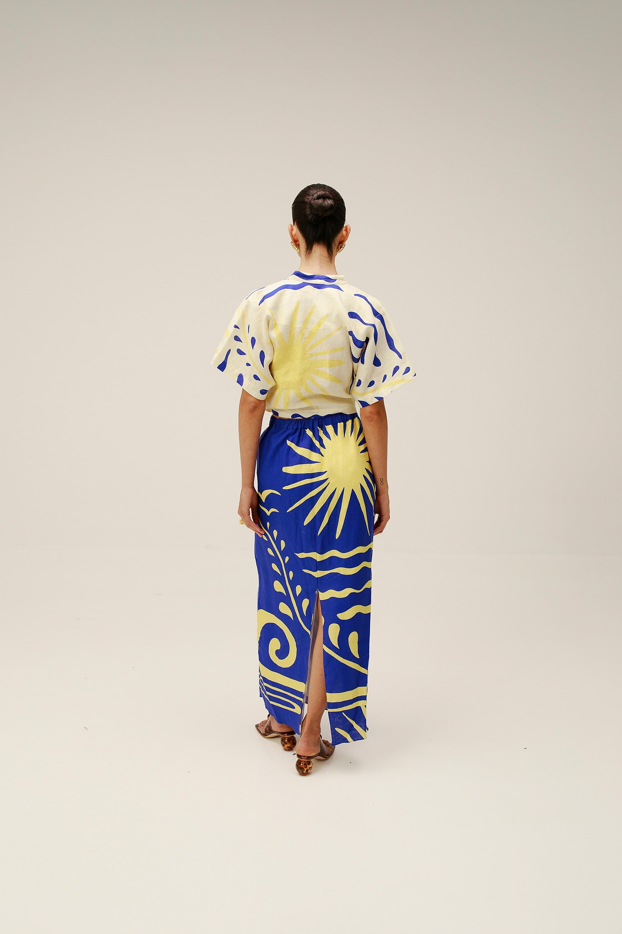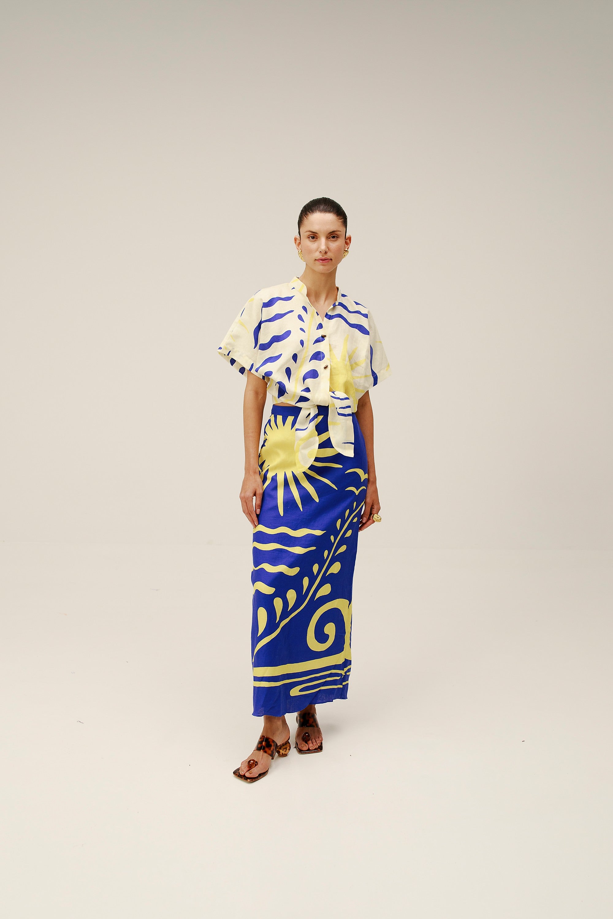 Short sleeve button-up shirt with a front tie detail. Made from 100% linen.