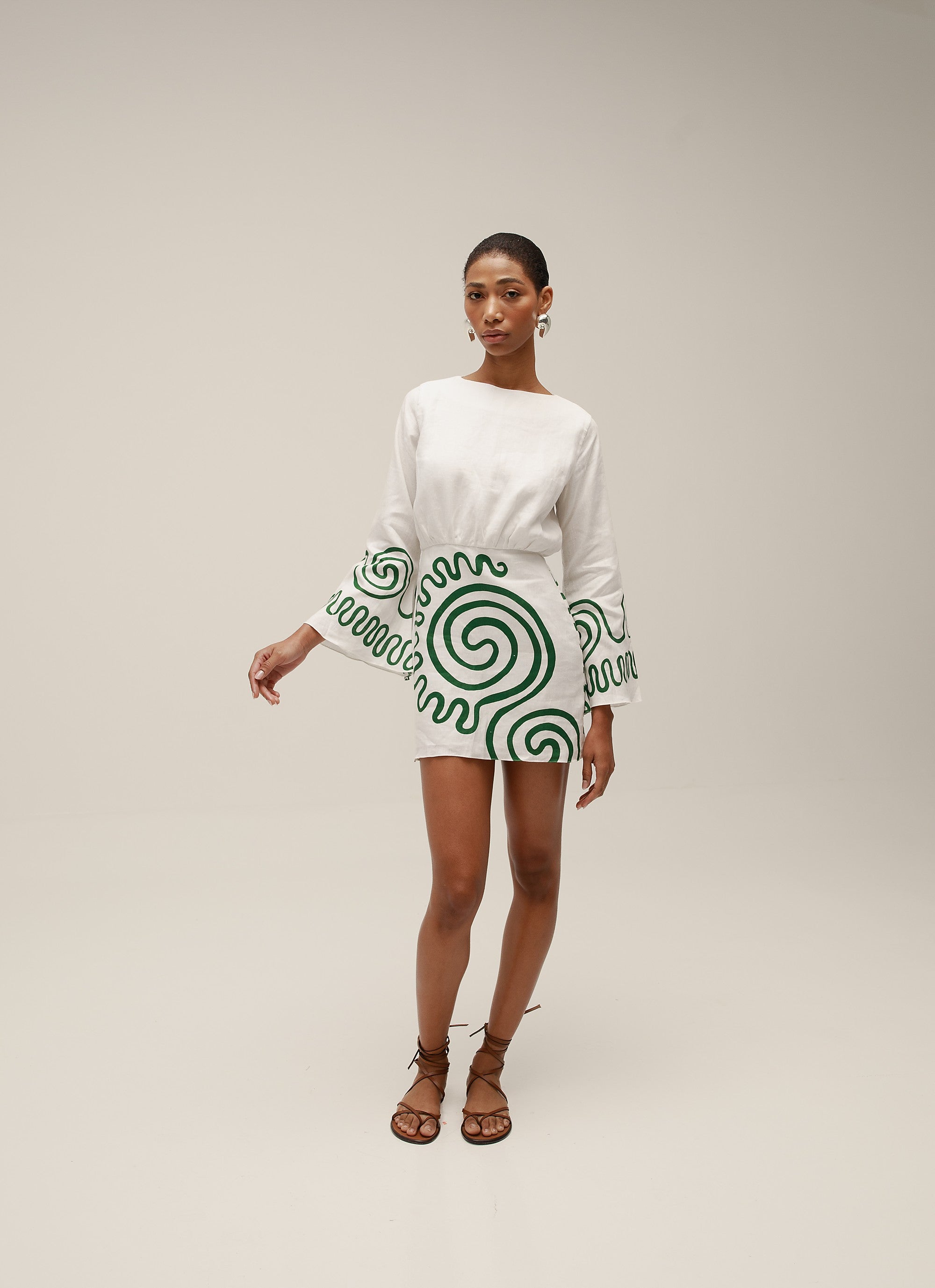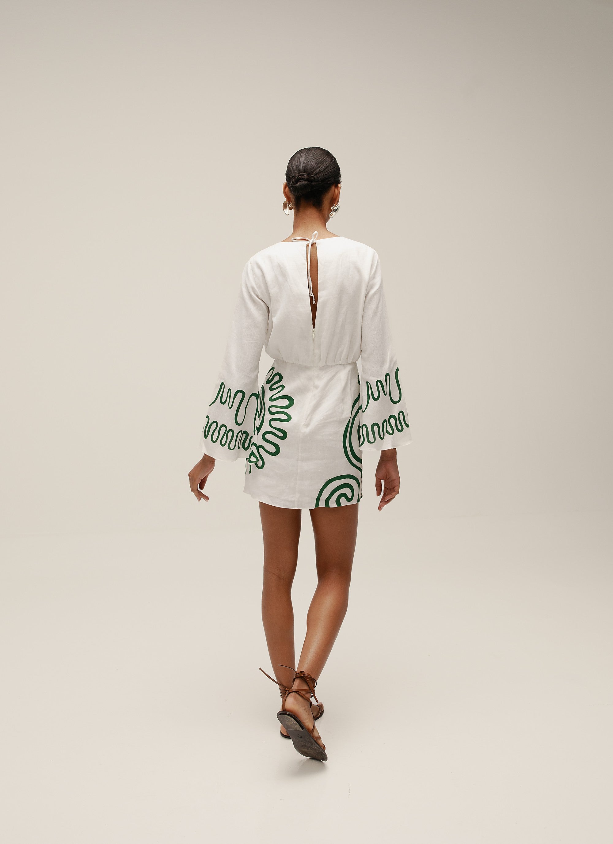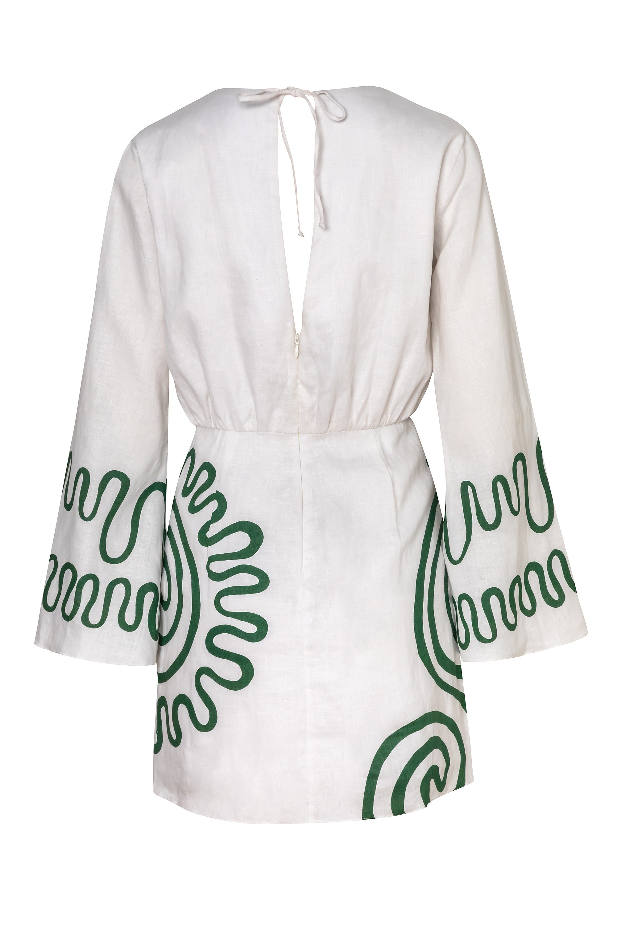 Long kimono sleeve mini dress with open back and tie closure. Fully lined. Made from 100% Linen.