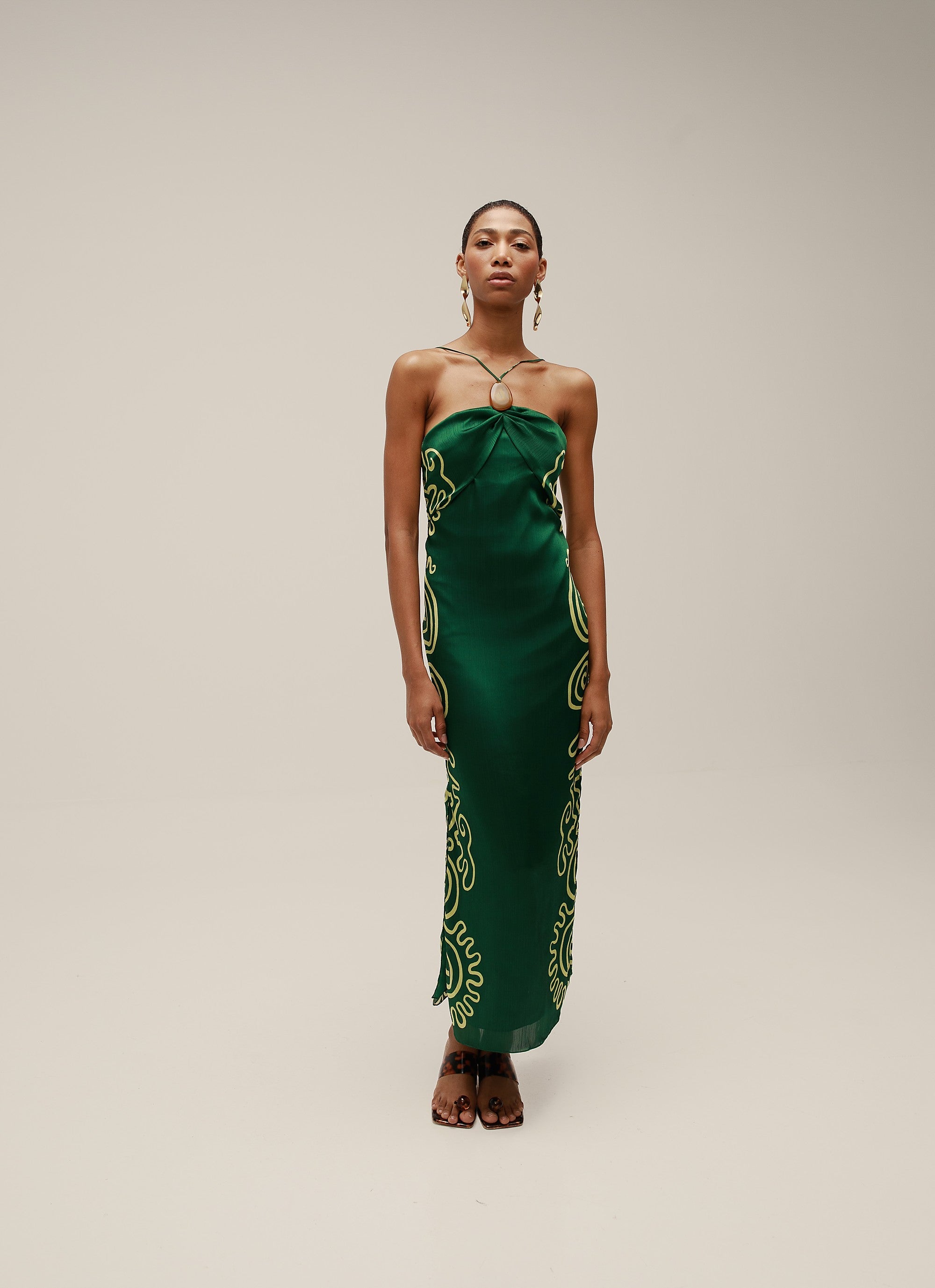 Halter style long dress featuring an extra large stone on straps. Fully lined. Made from 100% Polyester.
