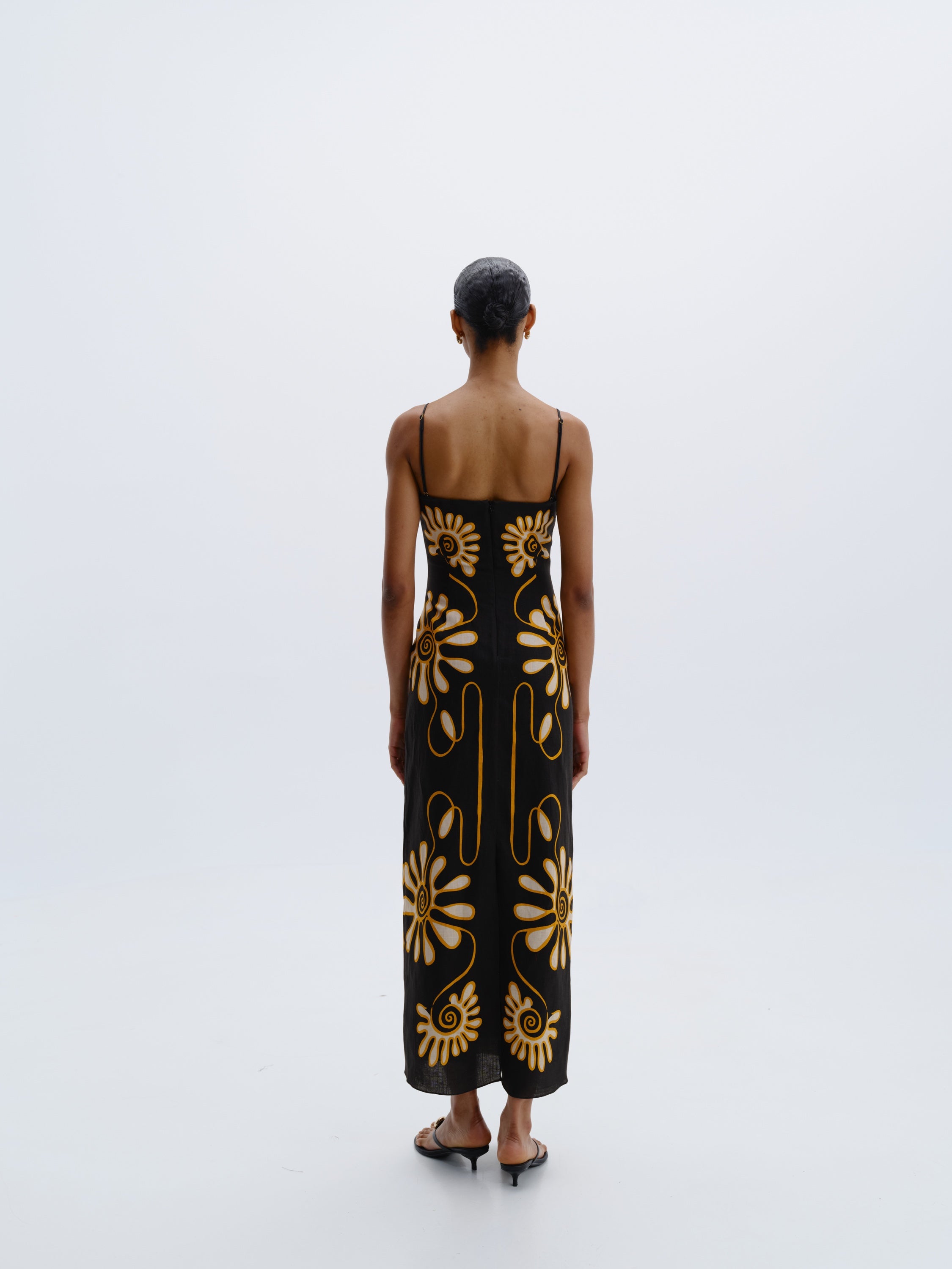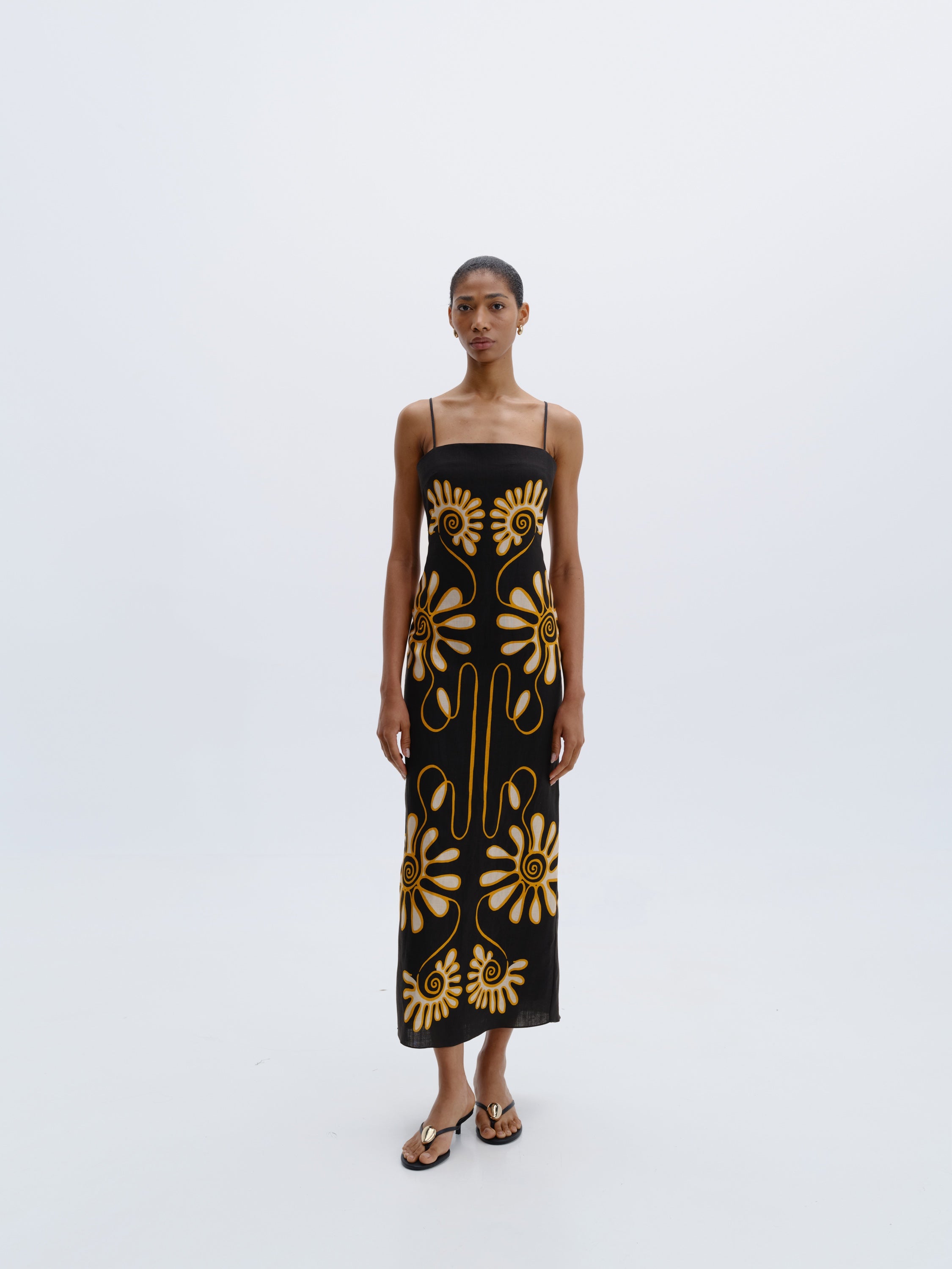 Square neckline long dress featuring thin straps and side slits. Fully lined. Made from 100% Linen.