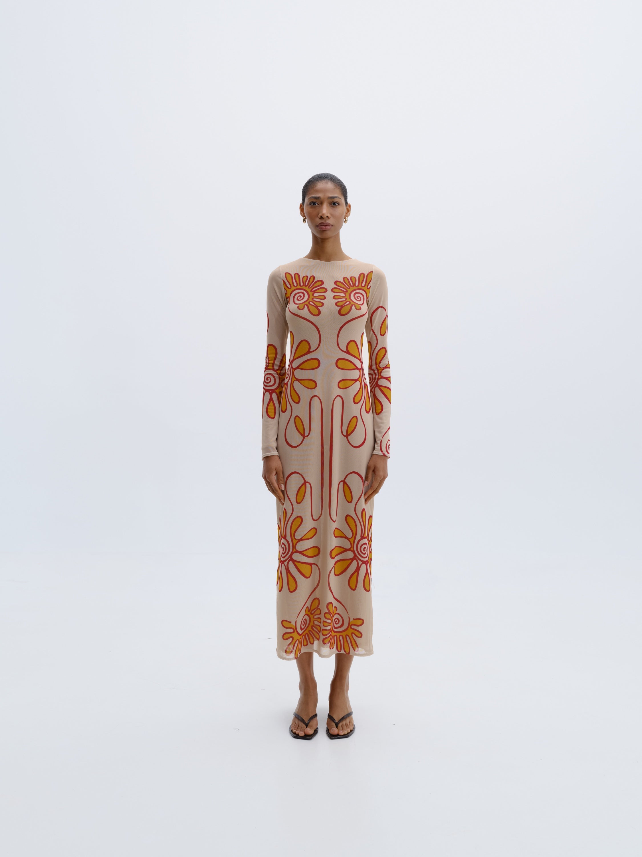 Midi dress with sheer fabric+ long sleeves+ and a round neckline. Fully lined. Made from 50% recycled polyester+ 44% polyester+ 6% elastane.