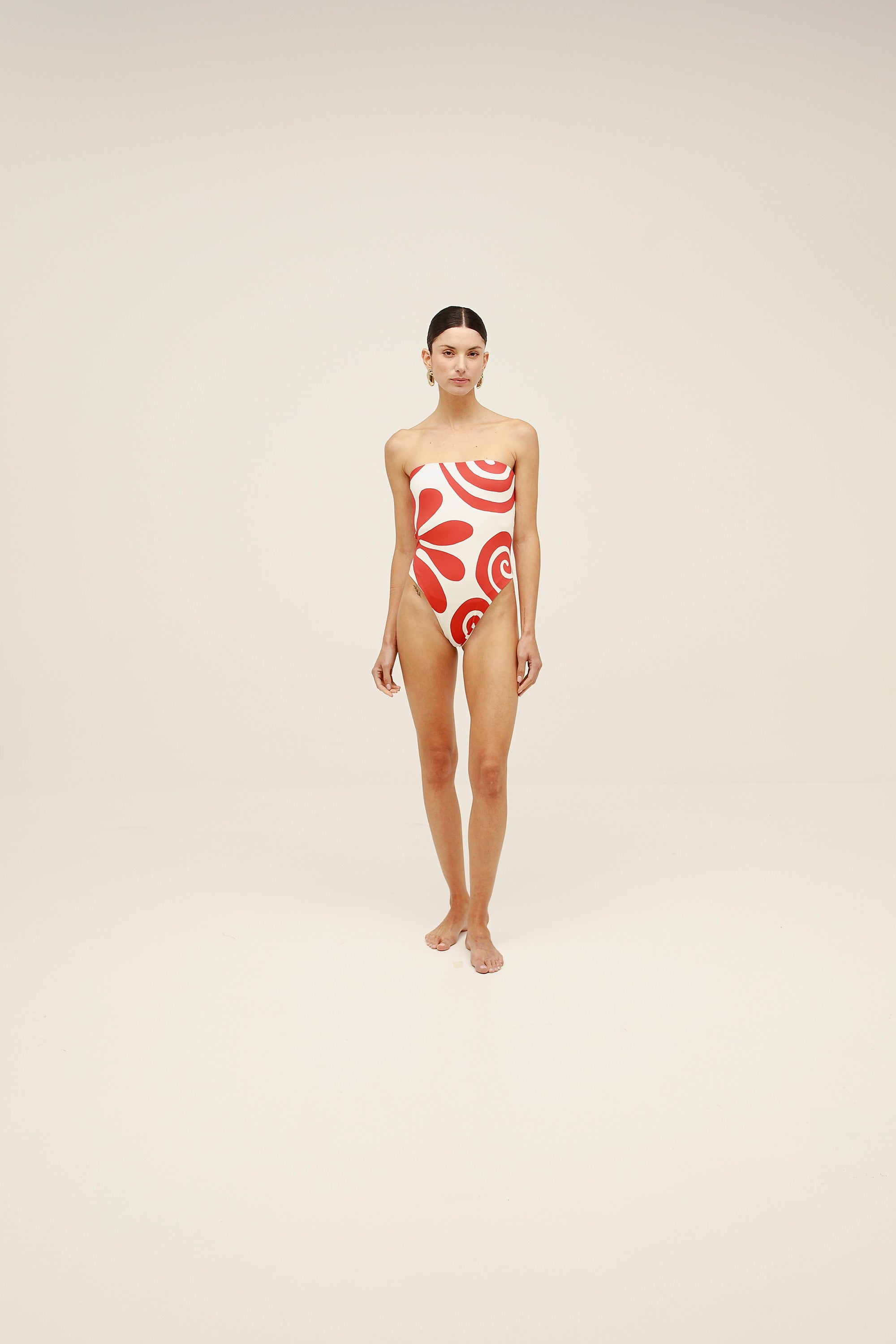 Strapless one-piece swimsuit with a straight neckline and high-leg cut. Fully lined. Made from 52% Pre-Consumer Recycled Polyamide, 30% Polyamide, 18% Elastane. With SPF 50+ protection.